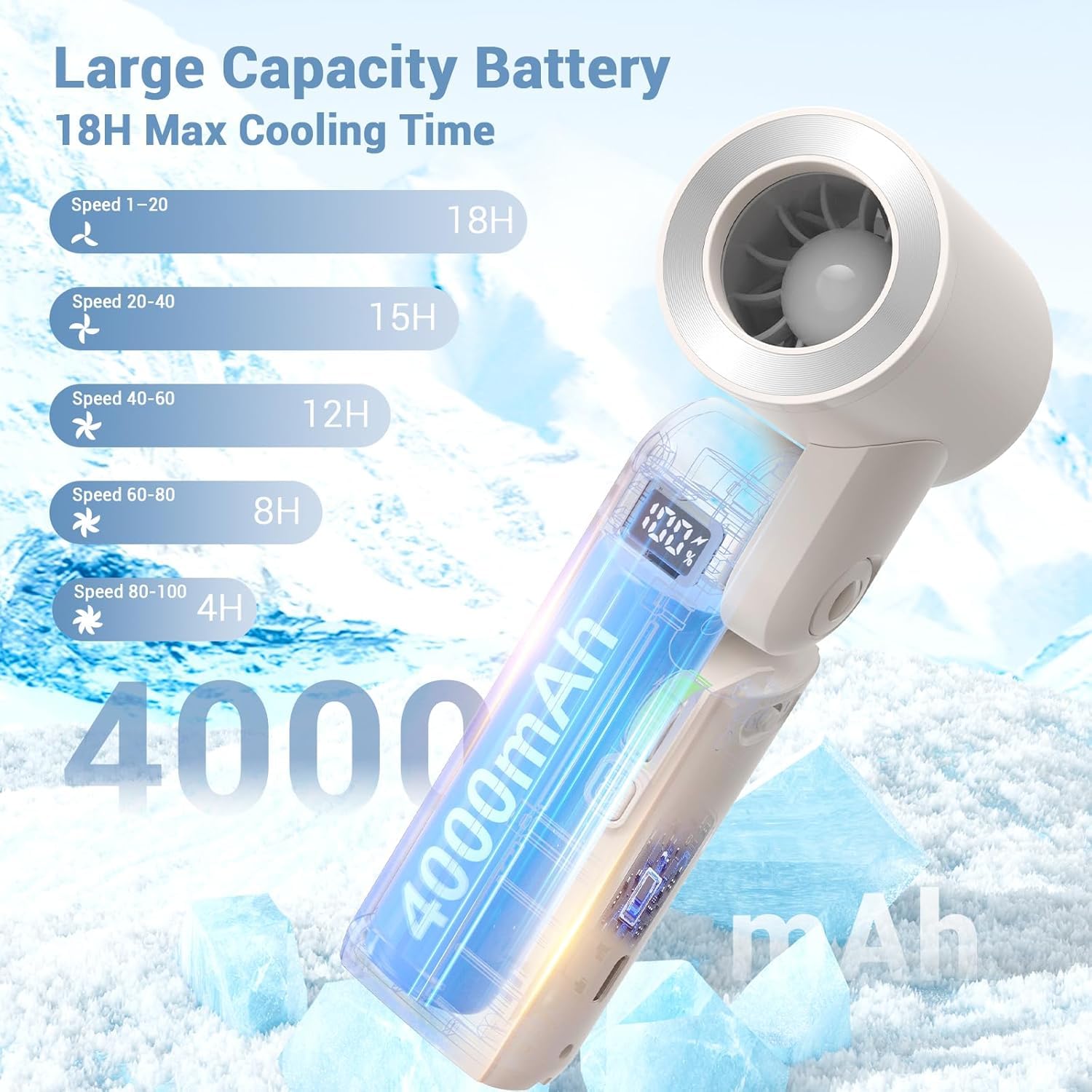 - 18 Hours Long Cooling Time: Our hand held fan boasts a high-capacity 4000mAh rechargeable battery. Enjoy up to 18 hours of continuous operation on a single charge, ensuring you stay refreshed from dawn till dusk. With the included USB to USB-C cable, it recharges fully in just 3 hours, so you're always ready for your next adventure. Say goodbye to frequent charging and enjoy uninterrupted comfort wherever you go. Especially as beach vacation essentials.