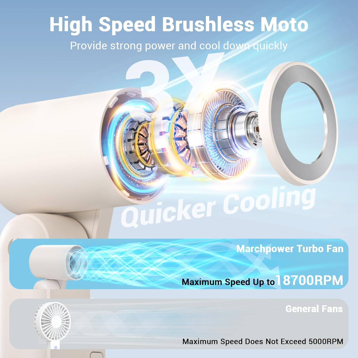 - Advanced Turbo Technology with 3x Faster Cooling: Marchpower portable fan features an advanced 7-blade design, powered by a high-speed brushless motor, achieving speeds up to 18700 RPM and wind speeds of 9m/s. It cools 3x faster than regular handheld fans, transforming hot air into a refreshing breeze in seconds, even on the hottest days. With its powerful cooling design, the face fan keeps you cool and comfortable at all times, perfect for long trips, camping, or outdoor activities in summer.