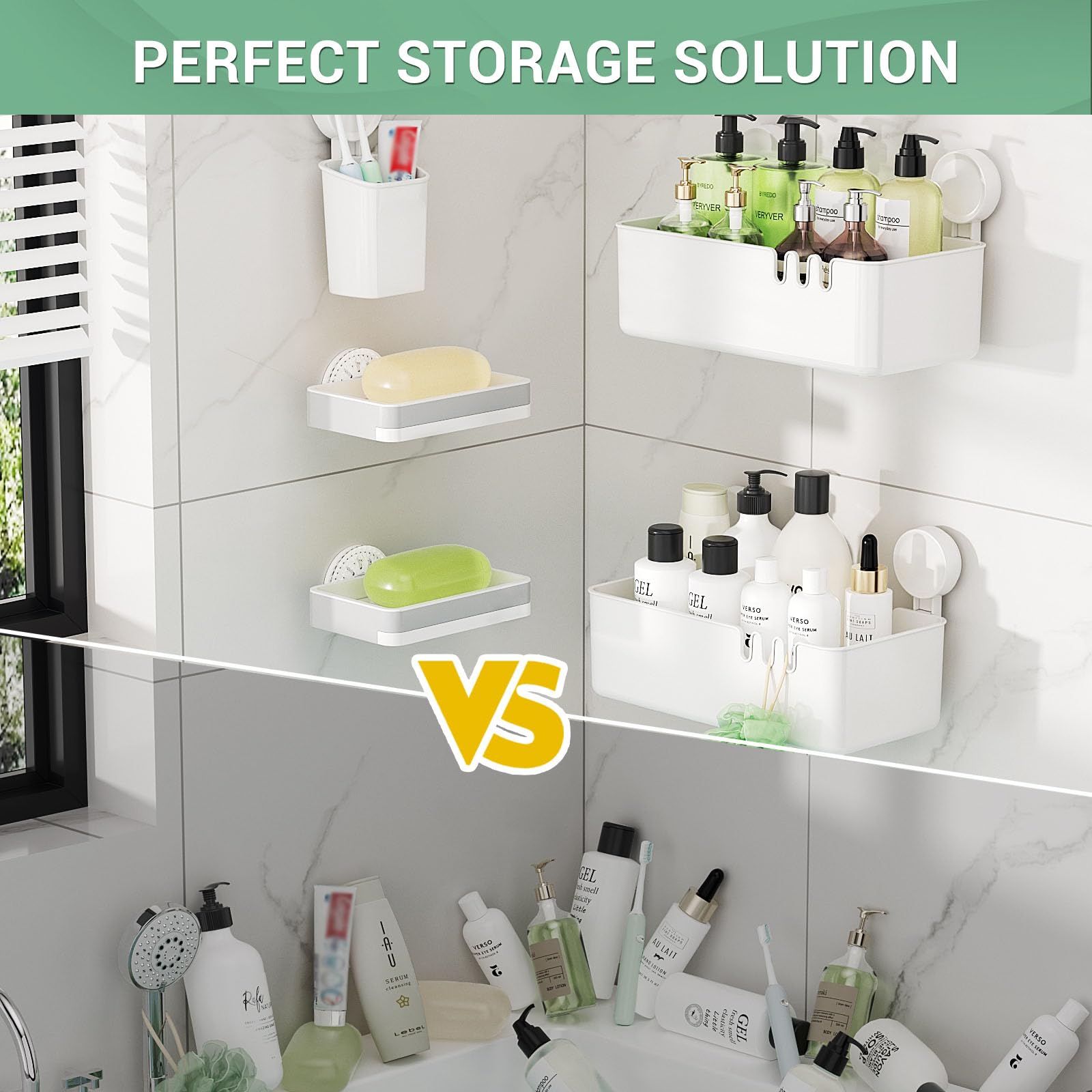 - 【5 Pack strong suction bathroom organizer】The bathroom organizers come with 5 pieces for different uses, including 2 shower caddies, 2 soap holders,1 toothbrush holder, which Offer a comprehensive solution for maximizing shower storage and organizing spaces.Say goodbye to clutter as you can neatly arrange soaps, razors, and more. The durable construction ensures long-lasting use, while the aesthetic adds a touch of elegance to any bathroom.